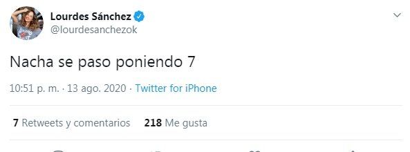 A través de su cuenta de Twitter, Lourdes criticó a Nacha Guevera por su devolución a Florencia Torrente quien interpretó un tema de Fito Páez junto a Michel Herst. Guevara punteó bien a la pareja pese a "problemas técnicas" y esto indignó a Sánchez quien escribió: "Nacha se pasó poniendo 7... No me gustó la performance", dijo en la red social al tiempo que soltó picante: "'Les tocó... ¡Re que eligen todo!", expresó haciendo hincapié en que las parejas de canto pueden elegir las canciones y también opinar hasta sobre los atuendos que utilizan en el show.