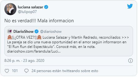 "Luciana Salazar y Martín Redrado se dan otra oportunidad. Reconciliados... Reencuentros, visitas, paseos en bicicleta, cenas... ¡Están más románticos que nunca!" decía el trino de Pecoraro.