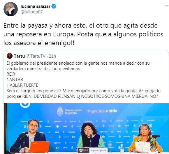 En tal sentido, Salazar dijo irónicamente: “ Entre la payasa y ahora esto, el otro que agita desde una reposera en Europa. ¡Posta que a algunos politicos los asesora el enemigo!”, escribió en su cuenta de Twitter e inmediatamente produjo la reacción de sus seguidores. "Todo bien!pero en que idioma queres que les hablen,parece que no entienden de ninguna manera, por ahí no es la forma, pero ya es insoportable ver que hay miles de contagios y no les importa nada!", fue uno de los mensajes en respuesta al tweet de Salazar.
