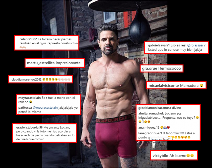 Hace unos días, subió a su cuenta una foto de su cuerpo tan bien formado, en boxer. Y las redes explotaron: "Luciano sos inigualable", "¿Eso es real?", le preguntaron a Sabrina Rojas, ""Se te fue la mano con el relleno", "Impresionante", "Me encanta Luciano pero cuando vi la foto me hizo acordar a los sketch de pachu cuando desfilaban en lo de Tinelli", dijeron algunos.