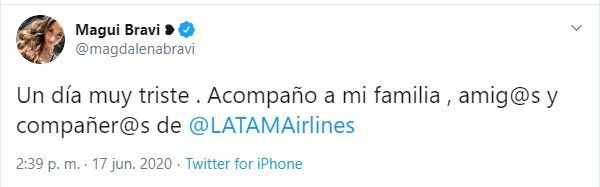 Un día muy triste . Acompaño a mi familia , amig@s y compañer@s de @LATAMAirlines, porstó Magui desde su cuenta Twitter @magdalenabravi