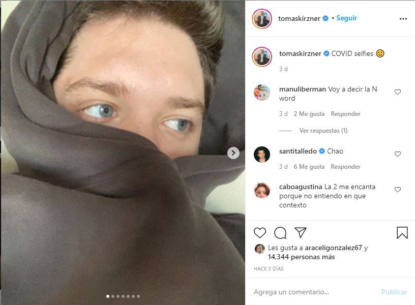 Tomás Kirzner publicó fotos a través de su cuenta en la red social Instagram, a las que tituló "covid selfies". En referencia a su contagio y al de su hermana, el actor dijo: "Nunca sabremos cómo nos contagiamos, creemos que nosotros no tuvimos nada que ver... Pero sí, el mismo mes estuvimos los dos contagiados. Ella se hisopó por otro contacto estrecho que tuvo y yo después lo tuve que hacer por protocolo porque empezaba los ensayos de una obra de teatro".