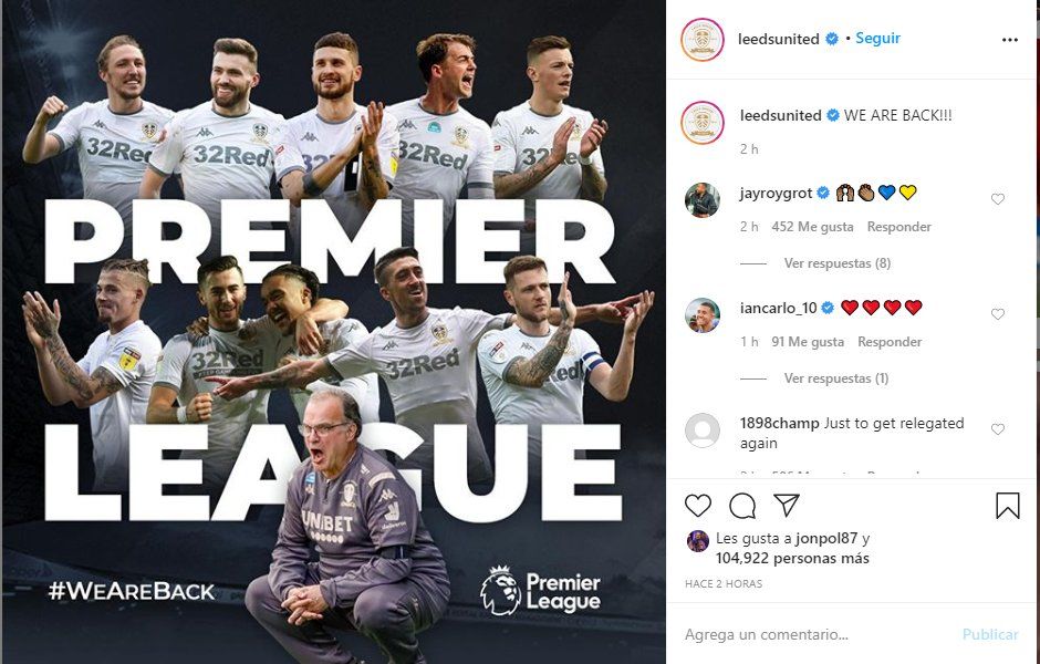 Con la caída del West Bromwich, Leeds United el equipo de Marcelo Bielsa logró ascender a la primera división de La Premier League