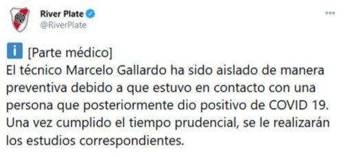 “El técnico Marcelo Gallardo ha sido aislado de manera preventiva debido a que estuvo en contacto con una persona que posteriormente dio positivo de Covid 19. Una vez cumplido el tiempo prudencial, se le realizarán los estudios correspondientes”, informó el club.