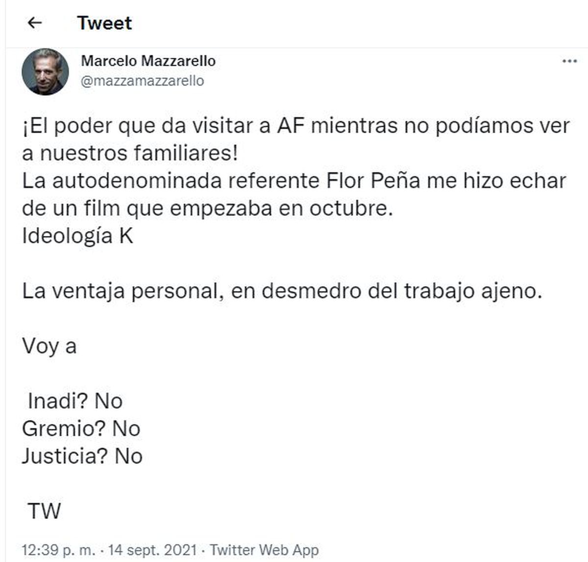 Según relató el actor Marcelo Mazzarello, él pidió a los productores hablar con Florencia Peña para aclara la situación, pero le dijeron que no era una buena idea porque Peña "estaba sensible". Tras quedar fuera del proyecto, el actor escribió en su Twitter: “¡El poder que da visitar a Alberto Fernández mientras no podíamos ver a nuestros familiares! La autodenominada referente Flor Peña me hizo echar de un film que empezaba en octubre. Ideología K, la ventaja personal, en desmedro del trabajo ajeno”.