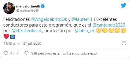 “¡¡Felicitaciones Ángel de Brito y Laurita!!! Excelentes conductores para este programón, que es el Cantando 2020 por El Trece. Producido por La Flia", escribió Marcelo en su cuenta de Twitter.