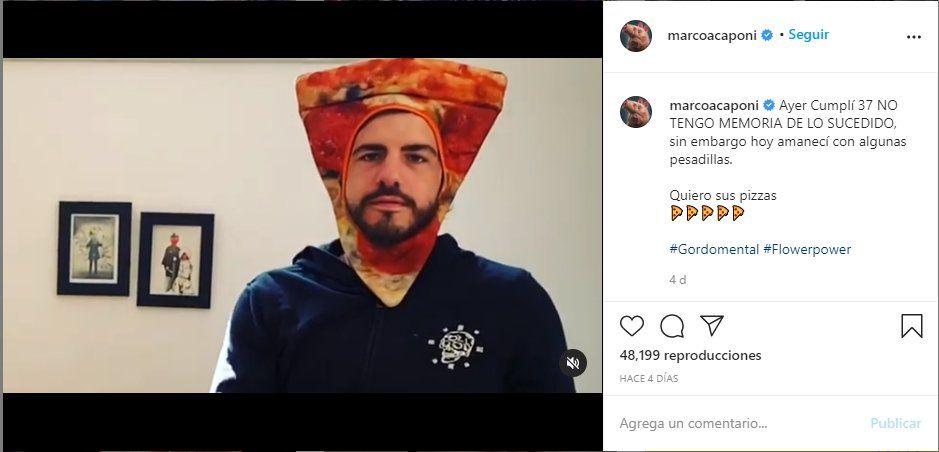 El día de ayer, justo cuando se cumplieron tres semanas de aquel primer post donde se confesaba adicto a la comida, Marco Antonio Caponi publicó: “Peso:94,5. Harinas no te tengo miedo. Celular sí te tengo miedo. He superado a mi mente, estos días, tengo miedo al bajón post felicidad. En 1 mes tengo que bajar los 90 kilos ¿Podré? ¡Quiero pizzas caras de pizza!”.