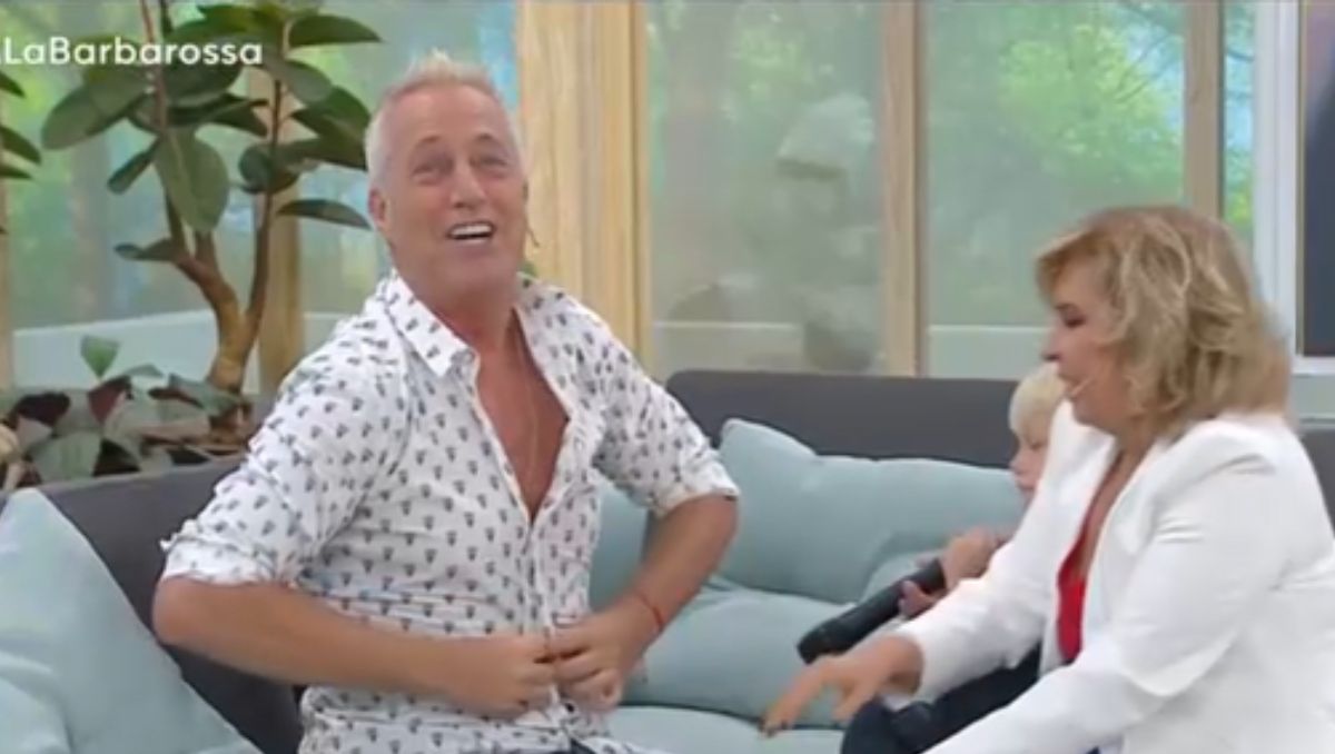 Mientras el conductor hablaba con Georgina Barbarossa, Mirko se subió sobre su padre y comenzó a brincar, lo que provocó que la camisa que tenía el conductor perdiera uno de sus botones y terminara dejándole el pecho al descubierto.