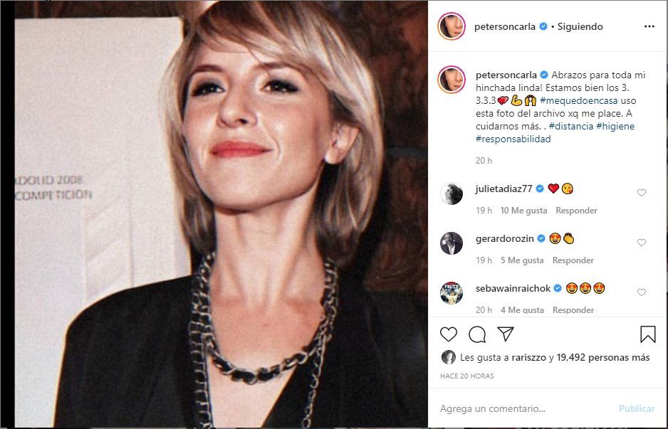 La bellísima actriz posteó un texto y una foto para aclarar la situación de su familia. La protagonista de Los exitosos Pells publicó: “Abrazos para toda mi hinchada linda. Estamos bien los 3. Me quedo en casa y uso esta foto de archivo porque quiero. A cuidarnos más”. La referencia a la imagen se basa en que Carla utilizó un registro de unos años atrás y prefirió aclarar su fecha para evitar críticas, de esas que abundan en las redes.