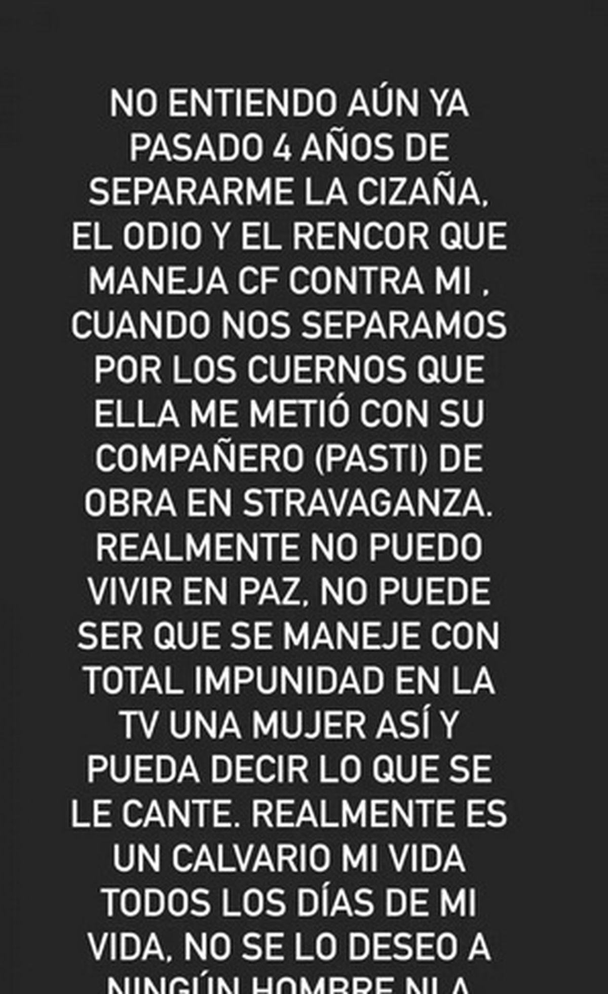 “No entiendo aún ya pasados 4 años de separarme la cizaña, el odio y el rencor que maneja CF contra mí", comenzó su descargo Defederico. “Cuando nos separamos por los cuernos que ella me metió con su compañero (Pasti) de obra en Stravaganza. Realmente no puedo vivir en paz”, detalló Matías.