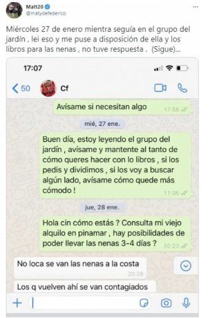 “Miércoles 27 de enero mientras seguía en el grupo del jardín, leí eso y me puse a disposición de ella... Los libros para las nenas. No tuve respuesta”, escribió Defederico en Twitter, junto a la captura del chat. Asimismo se puede ver cómo el le pregunta a Fernández si necesita algo para las nenas y no obtiene respuesta alguna.