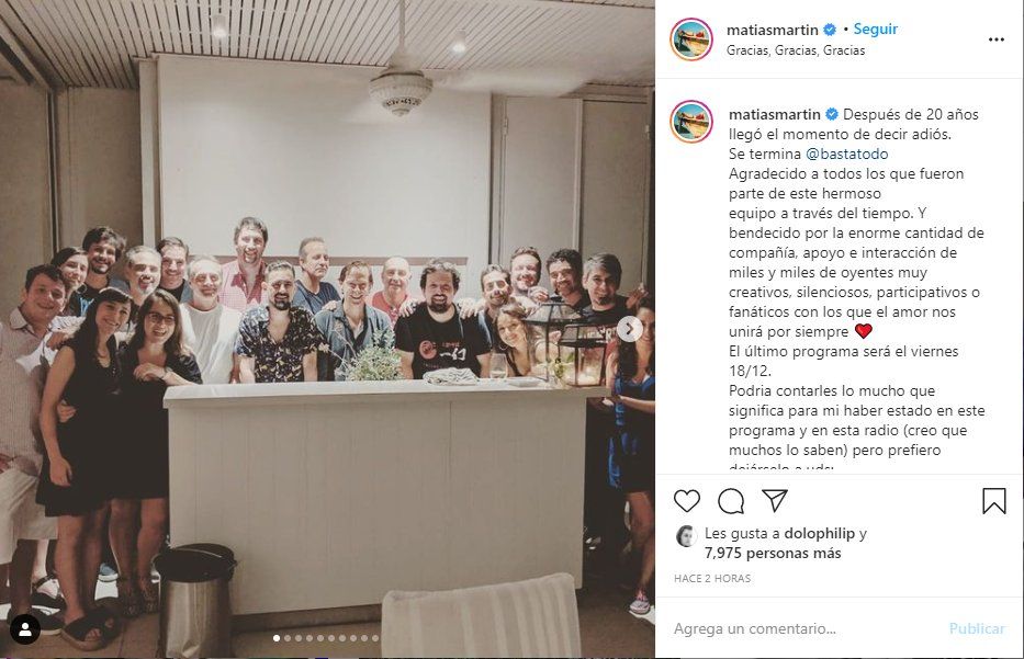 Matías Martin finalmente dio la noticia que sus oyentes no quería escuchar: “La notica es que se termina Basta de todo, después de 20 años termina. El último programa será el 18 de diciembre, en dos semanas. Dos semanas que tenemos para despedirnos, pero con la certeza de tomar una decisión con la que estoy en paz, estoy decidido a emprender este cambio que significa terminar un programa que es una parte de mi vida”. Expresó.