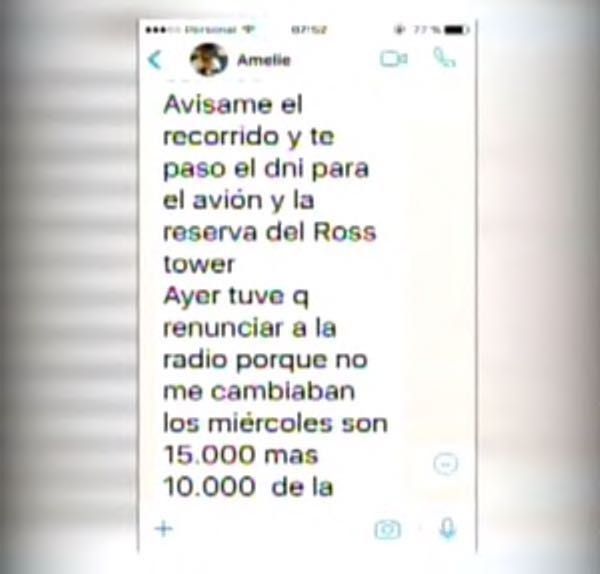 “Avisame el recorrido y te paso el DNI para el avión y la reserva del Ros Tower. Ayer tuve que renunciar a la radio porque no me cambiaban los miércoles. Son 15 mil, más 10 mil de la chica”, le escribió la modelo a Diez de Tejada, quien coordinaba la campaña.