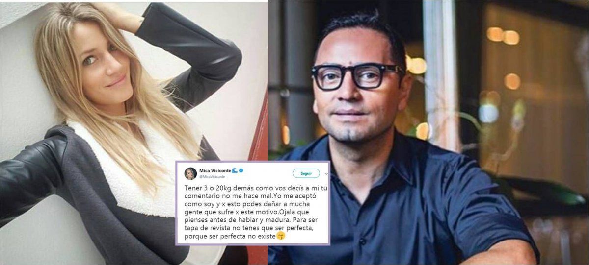 Una vez más Mica Viviconte le contestó fuertemente al diseñador Fabián Medina Flores. Sin nombrarlo, le dedicó un duro tweet en su cuenta personal: "Tener 3 o 20kg demás como vos decís a mi tu comentario no me hace mal.Yo me aceptó como soy y x esto podes dañar a mucha gente que sufre x este motivo.Ojala que pienses antes de hablar y madura. Para ser tapa de revista no tenes que ser perfecta, porque ser perfecta no existe".