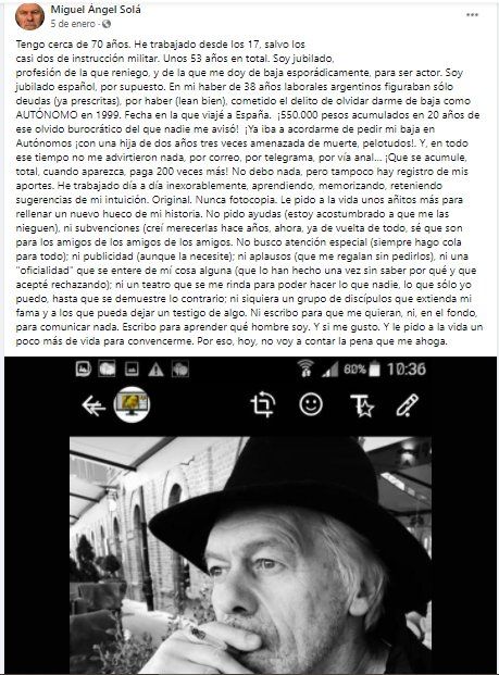 El actor inició la carta escribiendo lo siguiente: “Soy Miguel Ángel Solá. Nací el 14 de mayo 1950. En 1970 me estrené como actor, hasta hoy, 2020. Llevo cincuenta años sobre las tablas y frente a cámaras y micrófonos”
