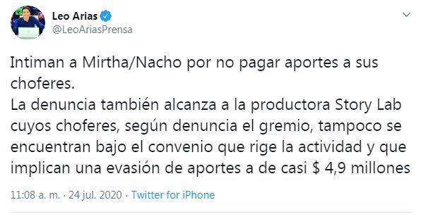 Por su parte, el periodista, Leo Arias anunció dicha información a través de su cuenta en Twitter donde escribió: "Intiman a Mirtha/Nacho por no pagar aportes a sus choferes. La denuncia también alcanza a la productora Story Lab cuyos choferes, según denuncia el gremio, tampoco se encuentran bajo el convenio que rige la actividad y que implican una evasión de aportes a de casi $ 4,9 millones".