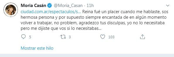 “Reina fue un placer cuando me hablaste, sos hermosa persona y por supuesto siempre encantada de en algún momento volver a trabajar. No problem, agradezco tus disculpas, yo no lo necesitaba pero me dijiste que vos sí lo necesitabas…así que fue una charla súper!!! #Enjoy y a seguir buscando camino!!!”, escribió en la red social luego de las declaraciones de Luna.