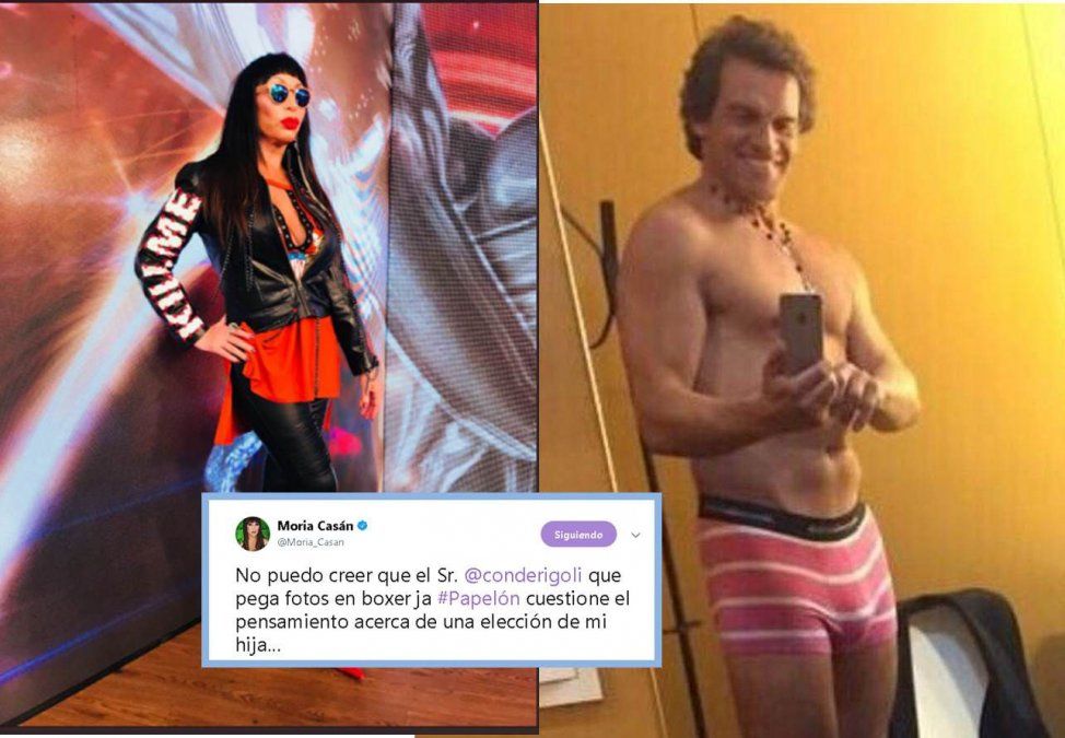 Una guerra twittera inesperada. Moria Casán envió una catarata de twitters dedicado al periodista Claudio Rígoli. Y no dudó siquiera que en recordar su famosa foto en bóxer: "No puedo creer que el Sr. @conderigoli que pega fotos en boxer ja #Papelón cuestione el pensamiento acerca de una elección de mi hija..."