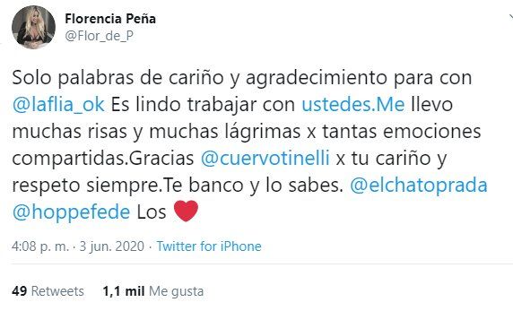 "Solo palabras de cariño y agradecimiento para con @laflia_ok Es lindo trabajar con http://ustedes.Me llevo muchas risas y muchas lágrimas x tantas emociones compartidas.Gracias @cuervotinelli x tu cariño y respeto siempre.Te banco y lo sabes. @elchatoprada @hoppefede Los " dijo Flor Peña el 3 de junio pasado a través de un tweet, en clara alusión a su renuncia al Bailando 2020.