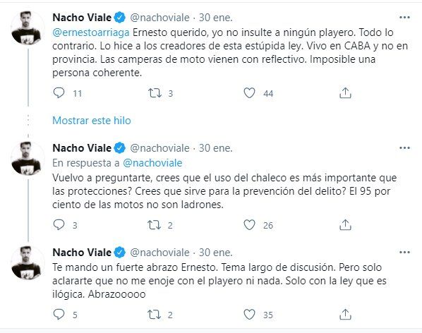 Posteriormente escribió Nacho Viale, a través del mismo hilo: “Más seguridad vial es usar protección que un chaleco. Yo cumplo la ley. Por eso fui y compré un bidón como sí esta permitido. No deja de parecerme una ley ridícula. Y no creo que el chaleco beneficie en absolutamente nada. La ley la cumplo y voto en las elecciones como dijiste. Pero eso no quiere decir que esté de acuerdo en todo”.