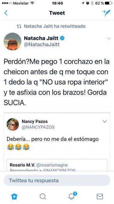 Esta declaración motivó la explosión de Natacha que no deja pasar una y tomó muy mal la declaración de Pazos y contestó "Perdón? Me pego corchazo en la cheicon antes de que me toque con 1 dedo la que "no usa ropa interior"y te asfixia con los brazos! Gorda SUCIA".