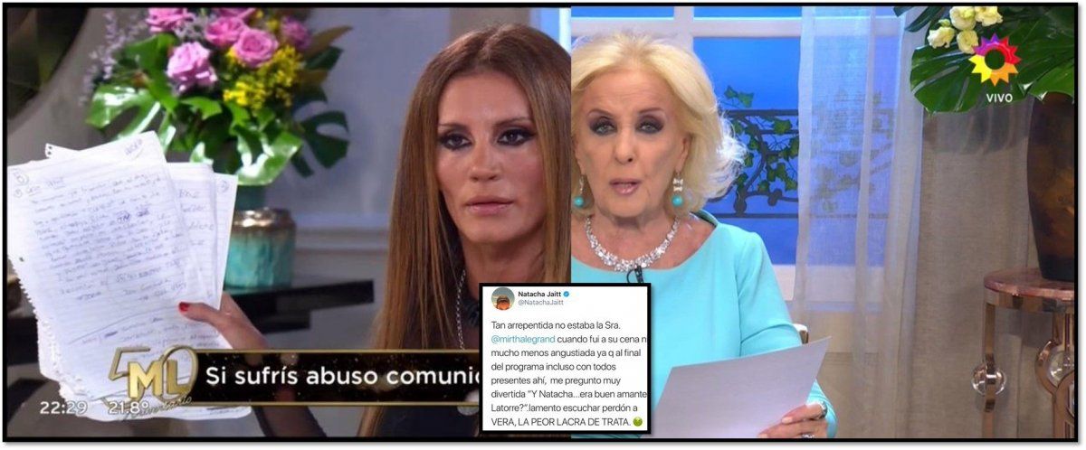 En simultáneo al descargo de Mirtha Legrand al aire de su programa, afirmando que ella nunca quiso llevar a su mesa a Natacha Jaitt y que tendría que haberle pedido que se levantara del programa y saliera del aire, además de pedir perdón y negar una operación política; Natacha Jaitt se expresó en Twitter.