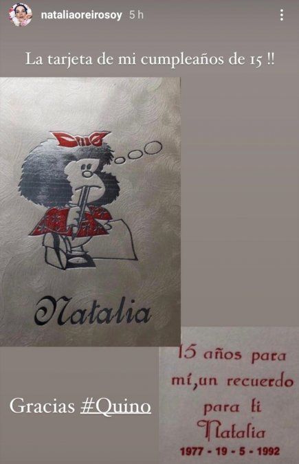 Natalia Oreiro honró la memoria de Quino, mostrando parte de su vida íntima. La artista utilizó su cuenta de Instagram para compartir la invitación a su cumpleaños de 15. Mediante una historia, la cantante publicó la tarjeta en la que se ve un dibujo de Mafalda con su nombre, y escribió: "La tarjeta de mi cumpleaños de 15. Gracias, Quino".