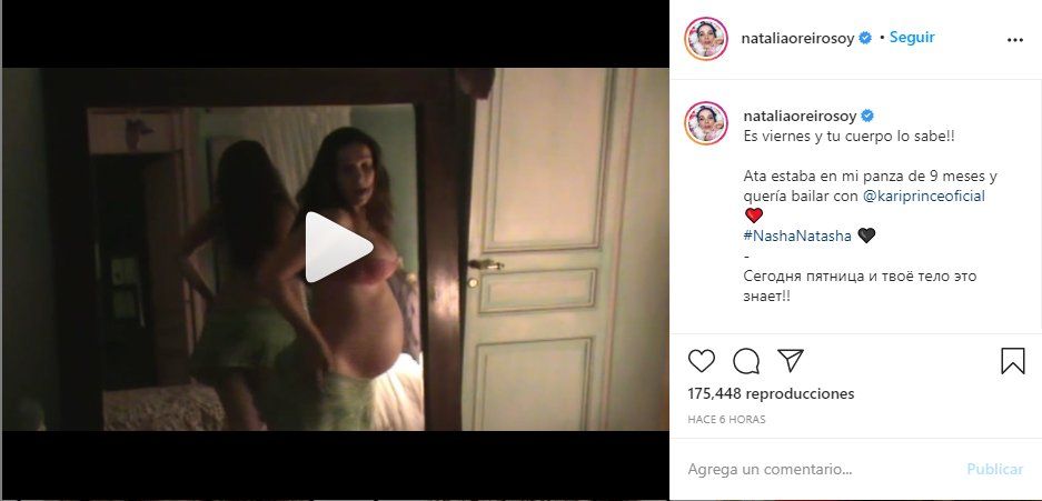 Hace algunas horas, Natalia Oreiro subió un posteo a Instagram. Se trata de un video junto al texto: "Es viernes y tu cuerpo lo sabe". En la imagen se la ve a la cantante transitando transitando su último mes de embarazo de Merlín Atahualpa, sin remera, y bailando frente al espejo un tema de cumbia de Karina "La Princesita".