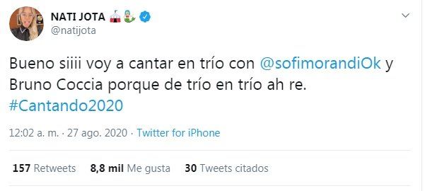 A través de las redes sociales, Nati comunicó que aceptaba el reto pero lo expresó con un picante y jocoso comentario, además haciendo refrencia al conflicto con la modelo y el rugbier. "Bueno, sí... Voy a cantar en trío con Sofi Morandi y Bruno Coccia porque de trío en trío, ah re. #Cantando2020", sostuvo de manera pícara y sin pensarlo los usuarios no tardaron en reaccionar.