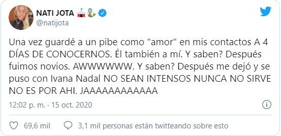 El tuit de Nati Jota decía lo siguiente: "Una vez guardé a un pibe como 'amor' en mis contactos A 4 DÍAS DE CONOCERNOS. Él también a mí. ¿Y saben? Después fuimos novios. ¡Awwww!", escribió la periodista. Sin embargo, el chiste llegó en la segunda parte de su mensaje, donde menciona directamente a Nadal. "¿Y saben? Después me dejó y se puso con Ivana Nadal", contó, y deslizó un consejo: "No sean intensos, nunca. No sirve, no es por ahí".