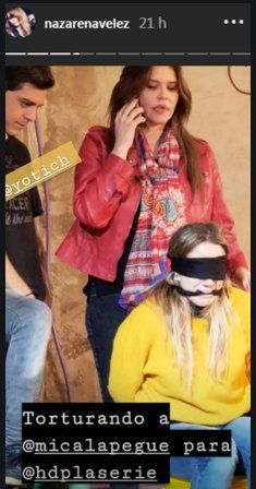 Según mostró Nazarena Vélez en sus historias de Instagram, la primera "víctima" de estos malhechores es Lucía (Micaela Lapegue). Pero parece que las cosas no les salen del todo bien ya que después Nazarena agregó: "Secuestradores secuestrados".