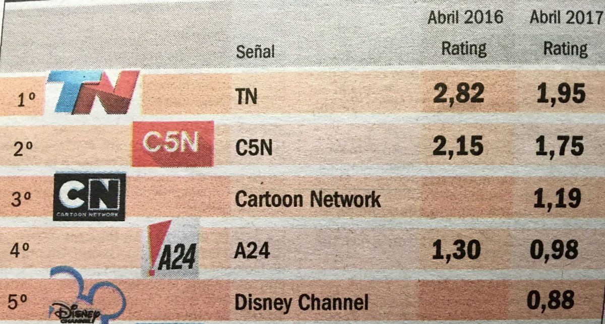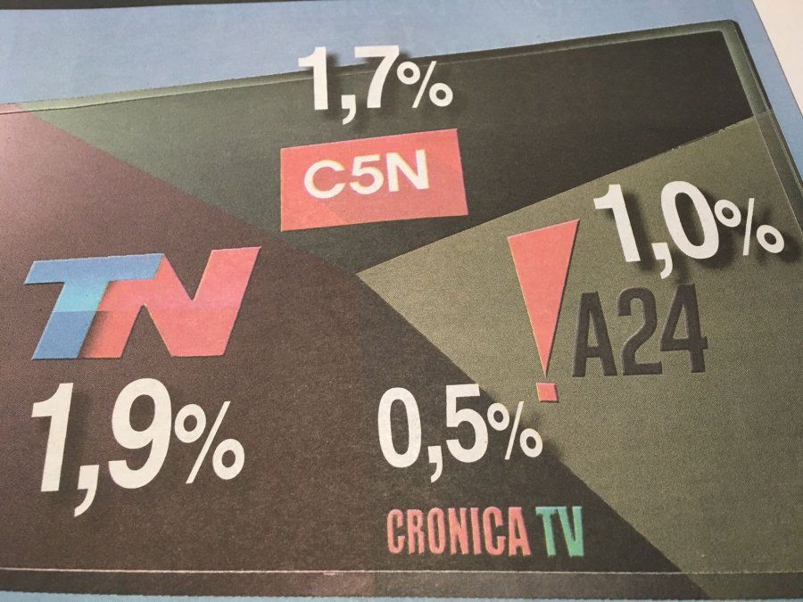 "En primer lugar está TN, con 1,95. Segundo C5N con 1,75. Tercero A24 con 0,98. Cuarto Crónica Tv con 0.49. Hace un año TN estaba primero con 2,82. Bajó su audiencia un 30%.