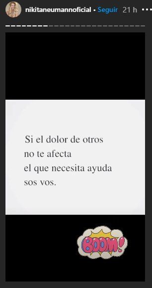 Incluso, Niki parece haber querido ir más allá con los escritos que compartió y agregó otro a su history, bajo la leyenda “Si el dolor de los otros no te afecta, el que necesita ayuda sos vos”. Horas atrás, Mica Viccionte, desde El show del problema, contó que el ex deportista tenía una preocupación lógica por la realidad de sus hijas pero que estaba bien.