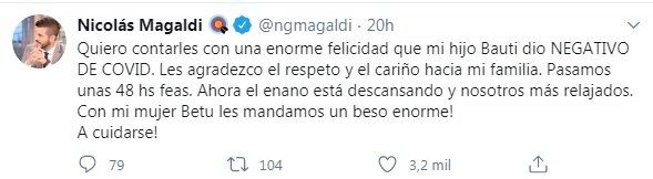 Nicolás Magaldi informó que su hijo dio negativo para coronavirus