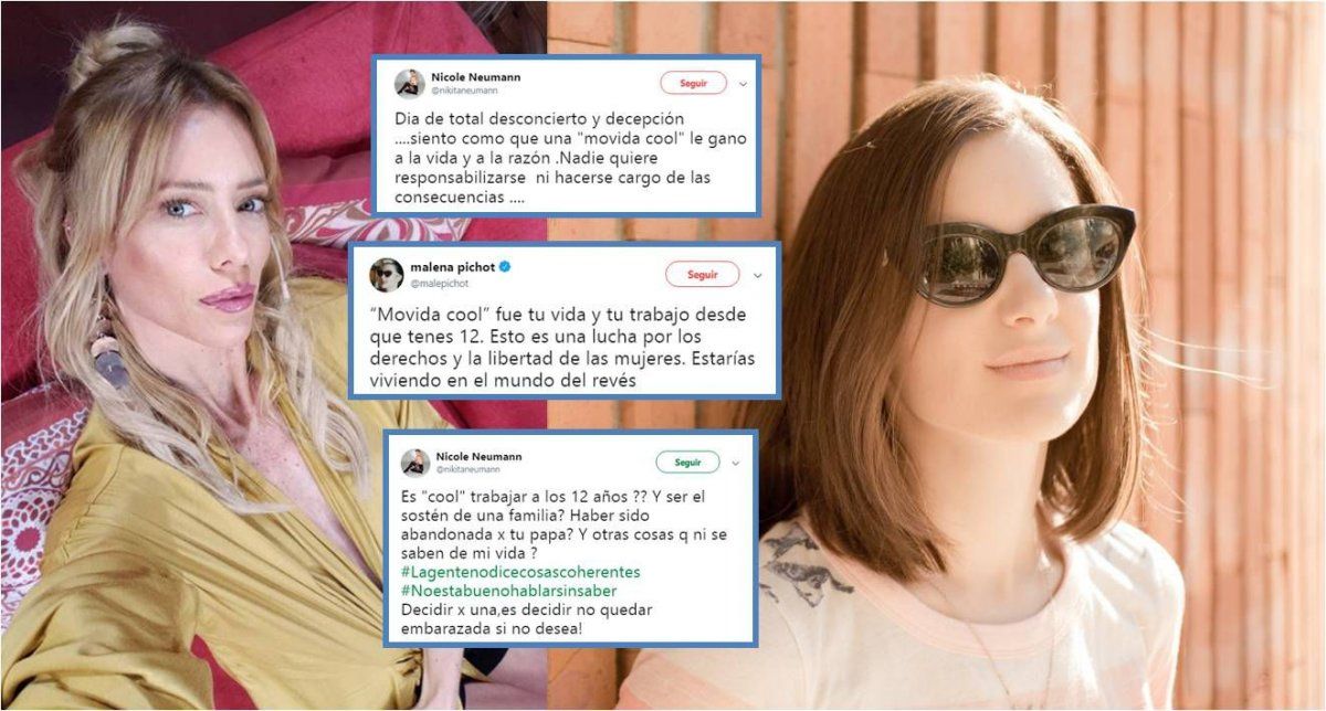 A raíz de ese tweet, se generó un duro cruce entre la modelo y Malena Pichot por el mensaje. Primero fue Malena quien respondió a ese tweet, diciéndole a Nicole: "'Movida cool' fue tu vida y tu trabajo desde que tenes 12. Esto es una lucha por los derechos y la libertad de las mujeres. Estarías viviendo en el mundo del revés".