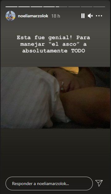 Entre las fotografías se destaca una selfie que Noelia Marzol se tomó de costado en su cama. Y tiene los orificios de su nariz tapados con papel, esto con el fin de no sentir ningún tipo de olor. Algo muy recurrente en las embarazadas es sentir náuseas ante cualquier aroma. Y si bien no le pasa a todas, la bailarina no fue la excepción. “Esta fue genial”, recordó sobre la selfie.