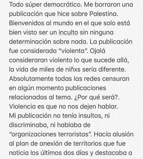 El descargo lo hizo a través de su cuenta en Instagram donde tiene más de 247 mil seguidores. Esta denuncia ya cuenta con 9mil likes."Violencia es que no nos dejen hablar. Mi publicación no tenía insultos ni discriminaba ni hablaba de "organizaciones terroristas"", dijo al tiempo que explicó: "Hacía alusión al plan de anexión de territorios que fue noticia los últimos dos días".