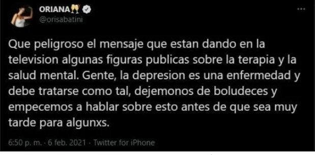 “Qué peligroso el mensaje que están dando en televisión algunas figuras públicas sobre la terapia y la salud mental”, escribió Oriana con notable indignación. Y continuó: “Gente, la depresión es una enfermedad y debe tratarse como tal. Dejémonos de boludeces y empecemos a hablar sobre esto antes de que sea muy tarde para algunxs”, escribió en su cuenta de Twitter.