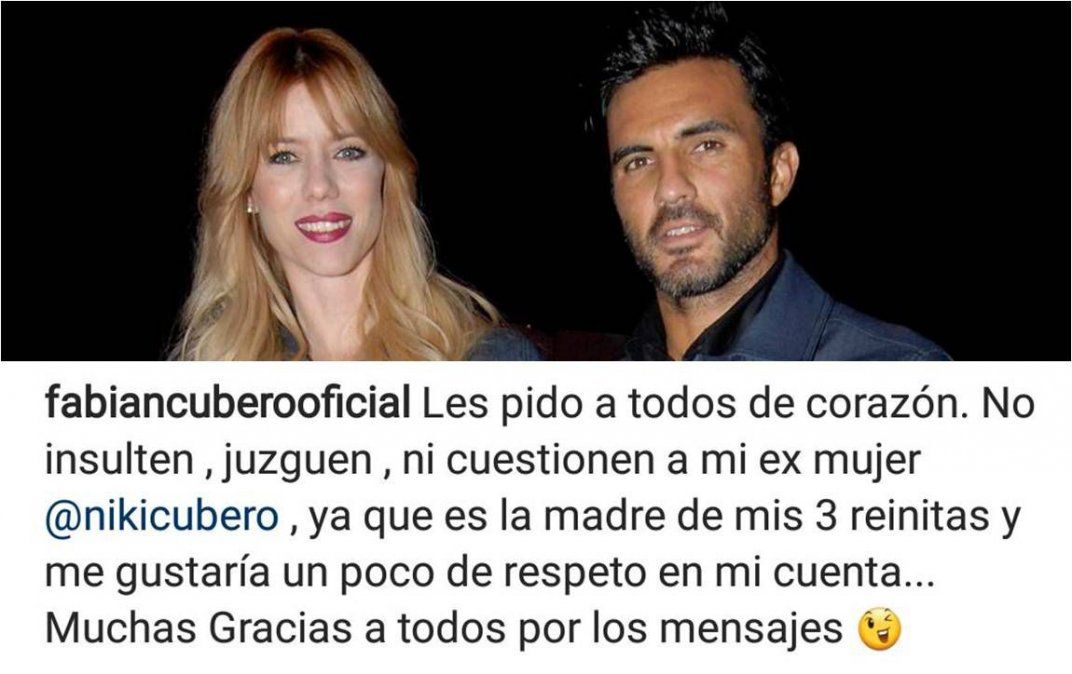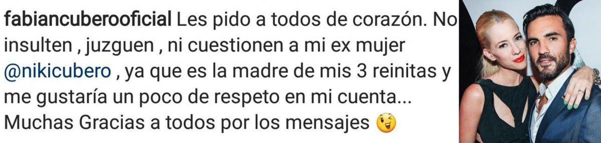 "Les pido a todos de corazón. No insulten, juzguen ni cuestionen a mi ex mujer @nikicubero, ya que es la madre de mis 3 reinitas y me gustaría un poco de respeto en mi cuenta.. Muchas gracias a todos por los mensajes".