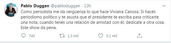 En tal sentido, Duggan expresó su opinión a través de su cuenta en Twitter donde escribió: "Como periodista, me da vergüenza lo que hace Viviana Canosa. Si hacés periodismo político y te asusta que el presidente te escriba para criticarte una nota, cuando tenés una relación de amistad con él, dedicate a otra cosa", opinó, picante. Y remató: "Este show da pena", fulminó a su colega.