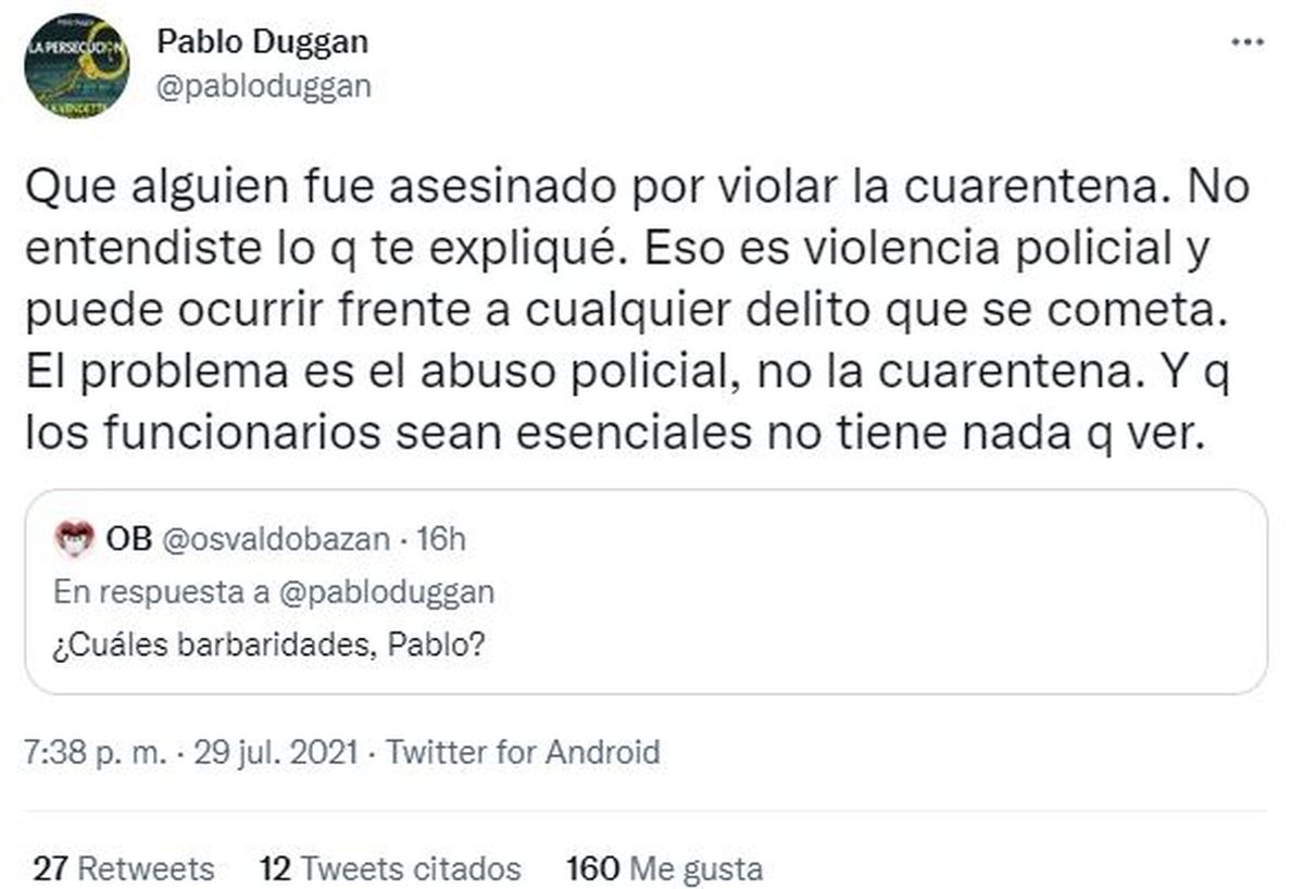 En otro hilo finalizó Duggan: “Mucho menos tienen que ver los funcionarios que, indefectiblemente, debían circular para cumplir con su trabajo esencial. Entiendo y comparto la preocupación por esas muertes. Pero encontraste un culpable equivocado. La cuarentena era absolutamente necesaria. El comportamiento asesino de algunos policías no la invalida. Que el odio no te haga perder el criterio”.