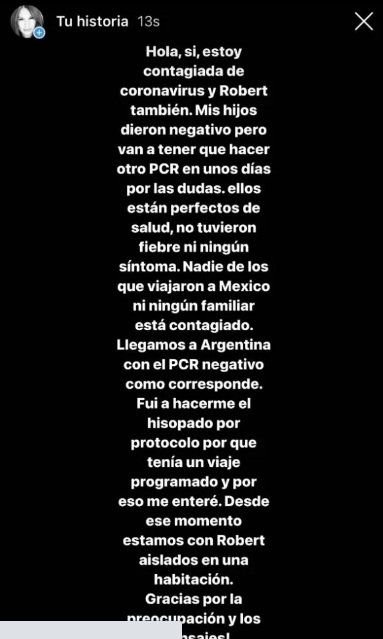 Asimismo explicó cómo se dio el contagio: “Nadie de los que viajaron a México, ni ningún familiar, está contagiado. Llegamos a la Argentina con el PCR negativo, como corresponde”, aclaró sobre sus recientes vacaciones, y al mismo tiempo precisó que: “Fui a hacerme el hisopado por protocolo porque tenía un viaje programado y por eso me enteré. Desde ese momento estamos aislados con Robert en una habitación ”.