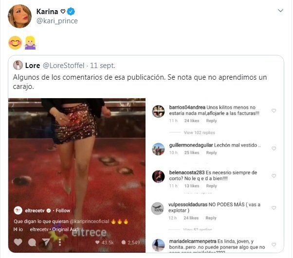 Hace unos días, Karina había dejado un mensaje de "aceptación" en su cuenta de Instagram que decía: “Les vengo a dejar un mensaje sobre la aceptación. Ayer entré a ver los mensajes de una publicación mía en el insta de @eltrecetv. Hacía bastante tiempo, no leía tantos mensajes agresivos hacia mi y mi cuerpo. GORDA DE MIERD…, CHANCHA, VACA, NO TENÉS EDAD PARA SHORT NI PARA ESE PEINADO, ESTÁ CHANCHA PERO TODAVÍA SIRVE PARA DARLE, RIDÍCULA, TENDRÍA QUE BAJAR 10 KILOS PARA USAR ESA ROPA, FLOJA ANCHA Y PLANA, TENÉS MUCHA GRASA EN LAS PIERNAS PARA USAR SHORT”.