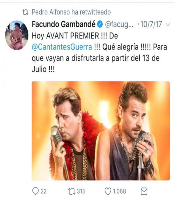 No saben bien por qué, pero Pedro solo realizó un retuit en su cuenta personal @pedroalfonso el 10 de julio, a propósito de la Avant Premier que se hizo. Y nunca más. Raro que no haya seguido promocionándola, como hace habitualmente con las fechas de la gira de su obra de teatro.