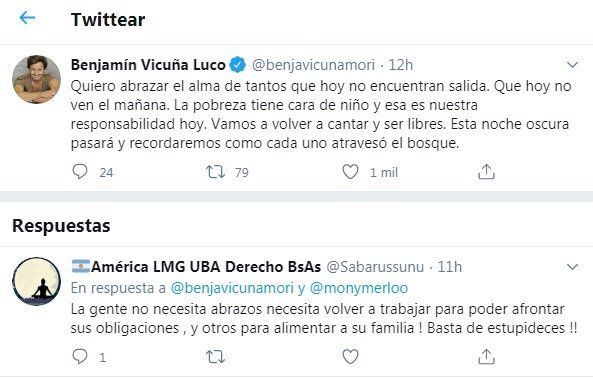 "Quiero abrazar el alma de tantos que hoy no encuentran salida. Que hoy no ven el mañana. La pobreza tiene cara de niño y esa es nuestra responsabilidad hoy. Vamos a volver a cantar y ser libres. Esta noche oscura pasará y recordaremos como cada uno atravesó el bosque", escribió Benja Vicuña en Twitter.