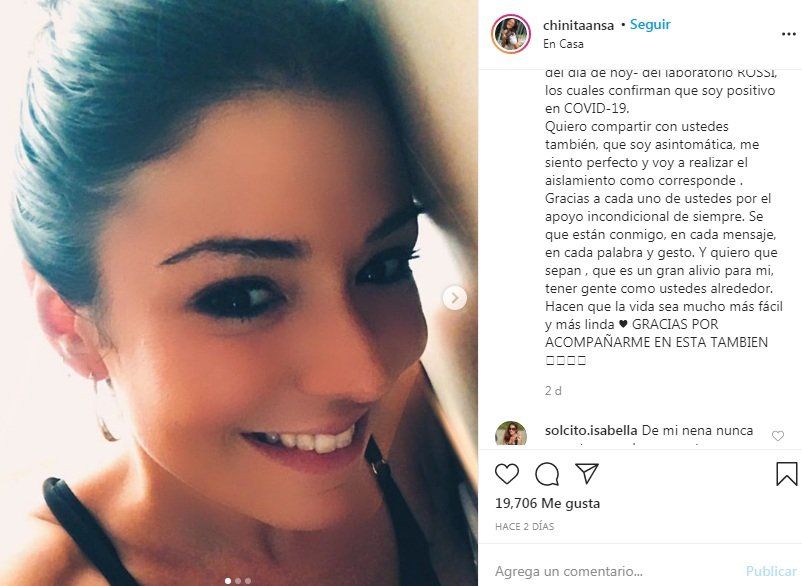 Asimismo dijo: "Quiero compartir con ustedes también, que soy asintomática, me siento perfecto y voy a realizar el aislamiento como corresponde .Gracias a cada uno de ustedes por el apoyo incondicional de siempre. Se que están conmigo, en cada mensaje, en cada palabra y gesto". Al tiempo que enfatizó: "Quiero que sepan , que es un gran alivio para mi, tener gente como ustedes alrededor. Hacen que la vida sea mucho más fácil y más linda ♥️ GRACIAS POR ACOMPAÑARME EN ESTA TAMBIEN".