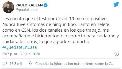 “Les cuento que el test por Covid-19 me dio positivo. Nunca tuve síntomas de ningún tipo”, comenzó el especialista en información policial. “Tanto en Telefé como en C5N, los dos canales en los que trabajo, me acompañaron e hicieron todo lo correcto para cuidarme y cuidar a los otros, lo que agradezco mucho. #QuedateEnCasa”, escribió a través de su cuenta en Twitter.