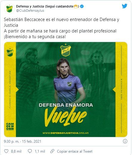 A través de la cuenta Twitter del club Defensa y Justicia lo informaban así: “Sebastián Beccacece es el nuevo entrenador de Defensa y Justicia. A partir de mañana se hará cargo del plantel profesional. ¡Bienvenido a tu segunda casa!”.