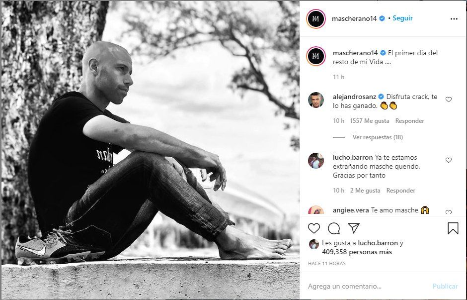 Al final de la mañana de hoy el ex jugador de futbol Javier Mascherano subió un posteo a su cuenta Instagram. En la fotografía blanco y negro se lo puede ver a Mascherano descalzo y vestido de remera y jeans; a su lado se ven los botines. La imagen la acompañó con la frase: “El primer Día del resto de mi Vida...”.