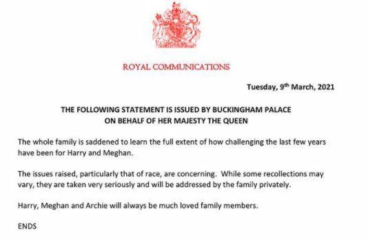 Luego que CBS hiciera publica la entrevista que le hizo Oprah Winfrey a los duques de Sussex Megan Markle y el príncipe Harry, donde acusó a la corona británica de ser racistas y no querer dar un título real a su hijo Archie por su color de piel; La Reina Isabel II emitió un comunicado para defenderse de las acusaciones.